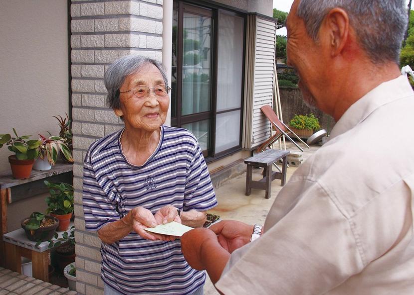 民生委員が受け持ちの地域の支給対象者の自宅を訪問して封筒入りの現金を直接届け、本人から受領印をもらうのが特徴。このため民生委員と接点が薄い人でも年一回は必ず面会でき、民生委員にとって受け持ちの地域の対象者の安否や健康状態を把握できる効果が生まれていた。