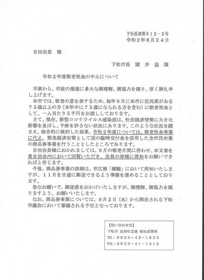 これに先立って市は8月24日、民生委員全員と各自治会長に敬老祝い金の中止と、緊急経済対策で国の臨時交付金を活用して全市民に1人当たり5千円の商品券を配布することになったことを説明する国井市長名の文書を送付した。とくに自治会長には回覧板で各世帯に周知するよう要請した。
