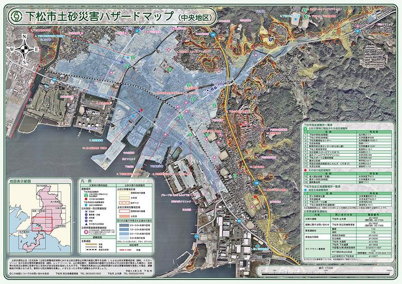 下松市中央地区の土砂災害ハザードマップ=浸水が予想される区域に避難所がある