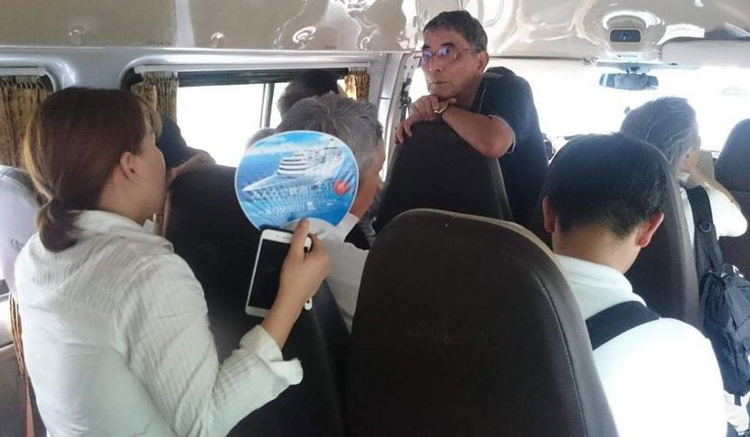 下松のうちわを手に岩本理事長と話す日本語通訳