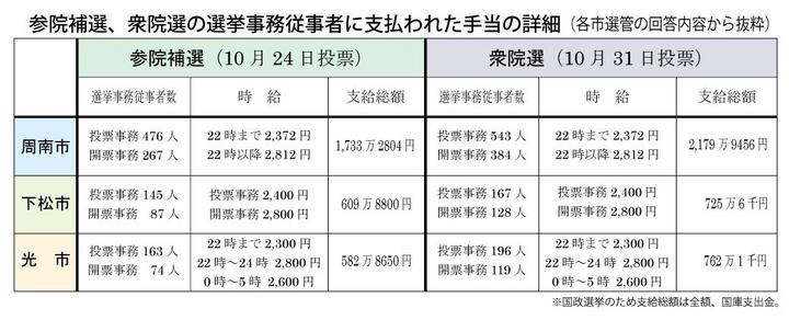まず驚くのは動員される職員に支払う手当の時給の高さだ。厚生労働省山口労働局が10月1日で改定した山口県の最低賃金は時給857円だが、周南3市の選挙事務従事者の手当の時給は2,300円〜2,812円。最高額と県最低賃金は約3.3倍の開きがある。