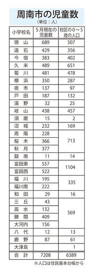 子どもの数が減り続けている。周南市の今年度の小学校の児童数は7,208人だが、6年後、小学生になる0歳から5歳までは6,389人で、11%も減少する。人口が増...
