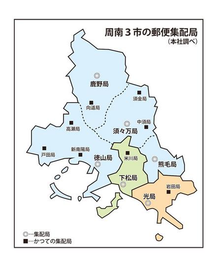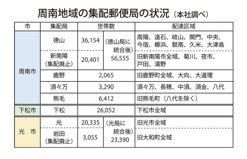 日本郵便は集配郵便局の“1市1局”化を進め、周南地域でも2月12日から周南市の新南陽郵便局の集配業務が徳山局に統合され、3月12日からは光市の岩田局の集配が光...