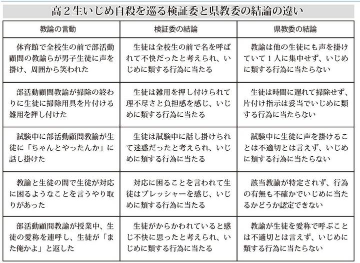 顧問教諭の言動とそれを巡る検証委と県教委の結論は表の通り。検証委が教諭らの5つの言動を「いじめに類する行為に当たる」と認定したのに対し、県教委は教諭の処分を決める調査で「いじめに類する行為に当たらない」と否定する結論を出した。