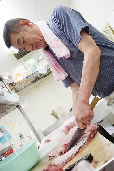出刃包丁で腹を割く。頭を落とす。 まな板の上にはコイならぬタイ。体長50センチ。岩国沖で漁獲され、朝に水揚げされた。 おろし包丁に持ち換える。背骨に沿...