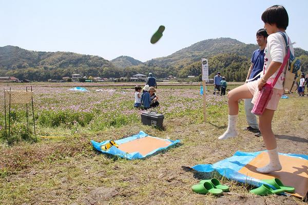 周南市戸田の道の駅「ソレーネ周南」東側の駐車場に面した約3000平方メートルの田んぼで16日、第8回れんげまつりが開かれ、レンゲが咲く田んぼでスリッパ飛ばしや...