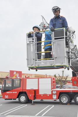 1日から7日までの春季全国火災予防運動にあわせ、周南市消防本部は3日、古市のイオンタウン周南で火災予防フェスタを開き、たくさんの親子連れなどが消防はしご車の試...