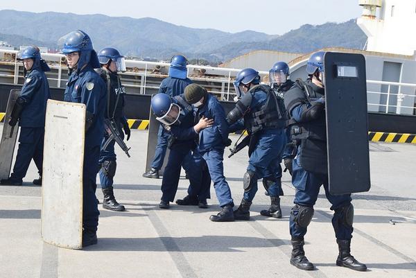 テロリストが乗った貨物船が周南市の徳山下松港の新南陽岸壁に着岸したという想定の徳山下松港水際対策総合訓練が2月27日、同岸壁であり、船舶3隻、車両9台も使い、...