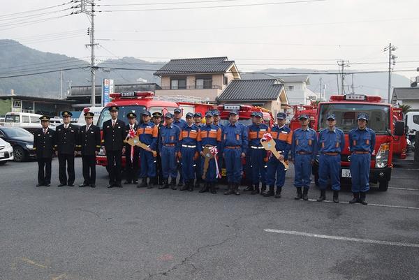 周南市消防団(神本康雅団長)の車両配備式が2月26日、市消防本部で開かれ、須金地区の北第5分団(吉安徹朗分団長)の須金機庫に消防ポンプ車▽大潮地区の北第10分...