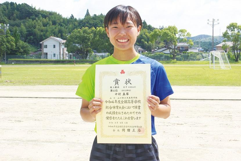 山口県光市の光高陸上競技部(田村信一郎顧問、55人)3年の中村真琴選手(末武中出身)が、3日から7日にかけて徳島県で開かれた全国高等学校総合体育大会(インターハイ)陸上競技大会の女子400メートルハードルで4位に入賞した。全国の舞台での入賞に「実感がわかないけど、目標だったのでうれしい」と喜んでいる。