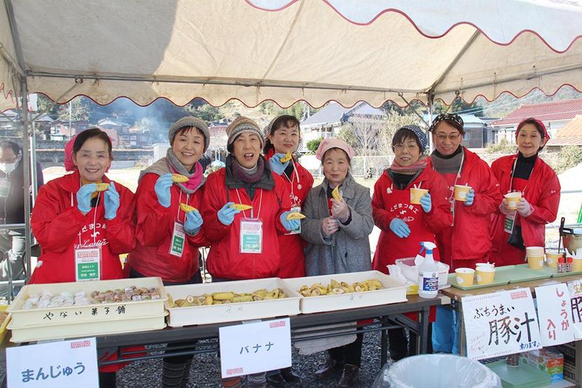 メッセージ入りバナナを手にする下松商工会議所女性会メンバー=深浦エイド