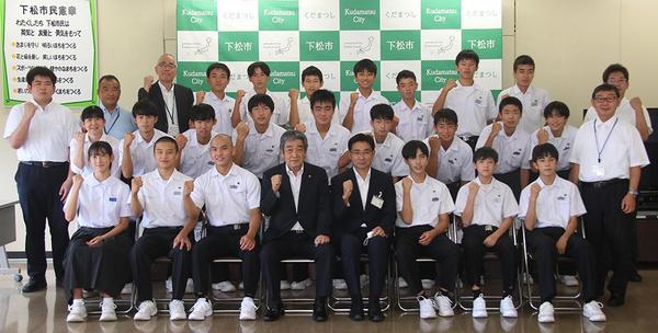 下松市中学校全国大会出場者激励会が10日に市役所で開かれ、夏休み中の全国大会に県代表または中国地区代表で出場する4種目の選手25人を国井市長、玉川良雄教育長ら...