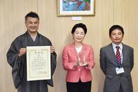 同部は今月から、全国大会4連覇がかかる全国高校総体に向けて新1年生も加えた新チームが始まり、メンバー入りを目指した競争がスタートする。国井市長は「下松市出身の選手が大活躍することを、市民とともに喜びたい。これからも勝ち続けて下さい」と励ましていた。