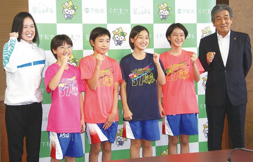 藤井コーチ(左端)、国井市長(右端)と選手たち