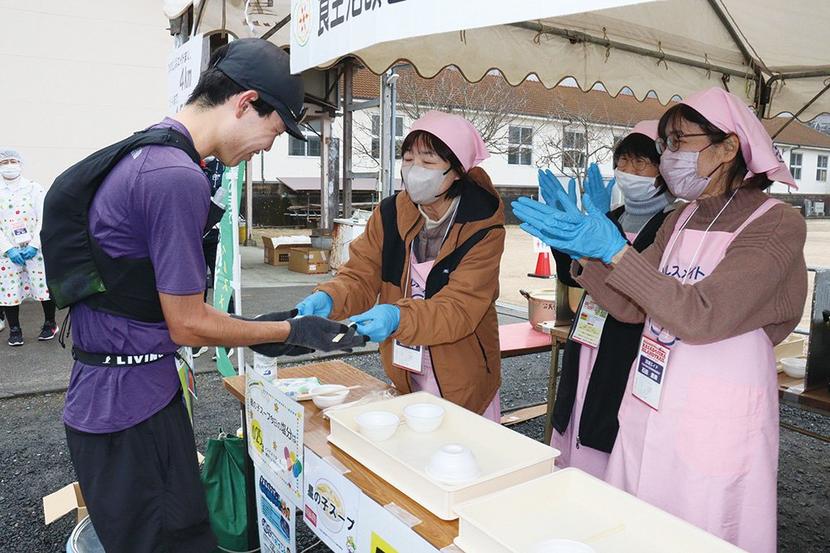 ランナーに軽食を提供する深浦エイドのメンバー
