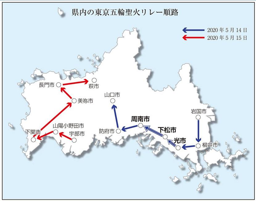 スポーツその他東京2020オリンピック・パラリンピック聖火リレー県実行委員会は2020年5月14、15日に県内を巡る五輪聖火リレーの順路を発表した。周南地区は初日に光市、下松市、周南市の順に回る。各市内の具体的なルートは年内をめどに決める。