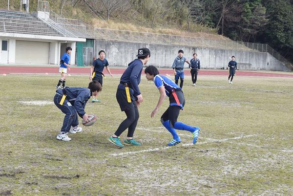 ラグビーを起源とするスポーツ、タグフットボールの第1回県大会が25日、周南市の徳山大学グラウンドで開かれ、五チームの約50人が対戦した。 このスポーツはオー...