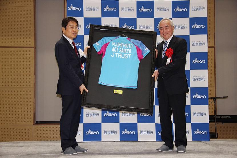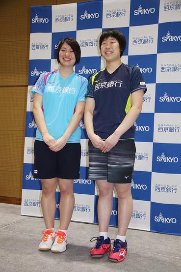 新しいユニフォームの斎藤主将(右)と中村選手