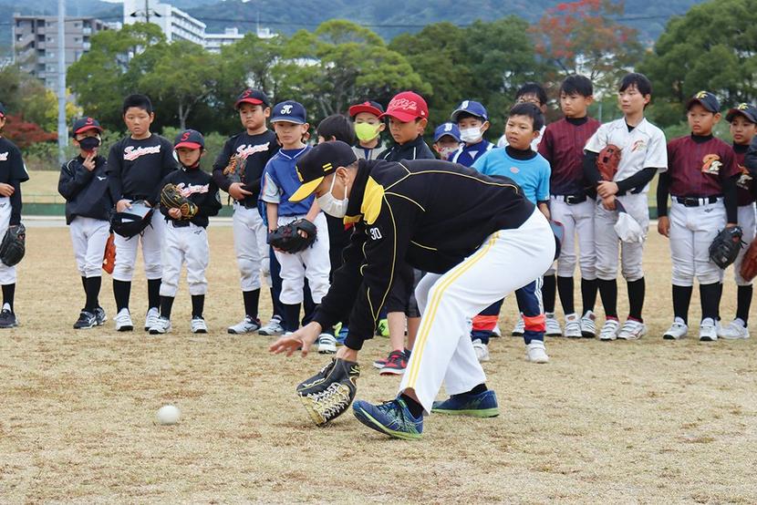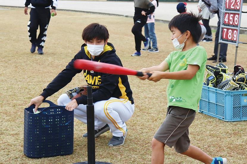 指導したのは出口雄大元内野手、新垣渚元投手、山口県出身の児玉龍也元投手。野球の経験のある子どもには実践的な投げ方、捕り方、打ち方を指導し、野球に慣れていない子どもには身振り手振りでていねいに教え、子どもたちも楽しく体験していた。