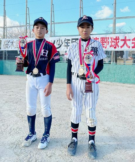 最優秀選手賞には優勝した久保の6年、相田英二選手、平田の椋春翔選手が選ばれ、新周南新聞社提供のトロフィーが贈られた。