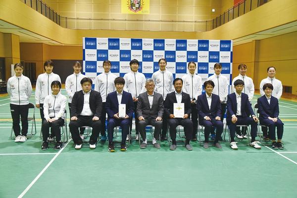 山口県周南市の西京銀行行員の実業団女子バドミントンチーム「ACT SAIKYO」のトップスポーツクラブ指定証交付式が21日、栗屋のACTアリーナで開かれ、指...