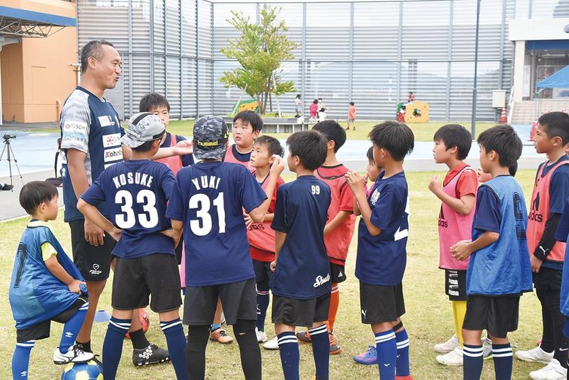 サッカーJ2で戦うレノファ山口のコーチが指導する「中山元気コーチとサッカー教室」が6月27日、山口県周南市のボートレース徳山の芝生広場で開かれ、今宿岐山FCの...