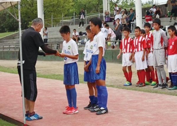 サッカーJ2で戦うレノファ山口のコーチが指導する「中山元気コーチとサッカー教室」が6月27日、山口県周南市のボートレース徳山の芝生広場で開かれ、今宿岐山FCの...