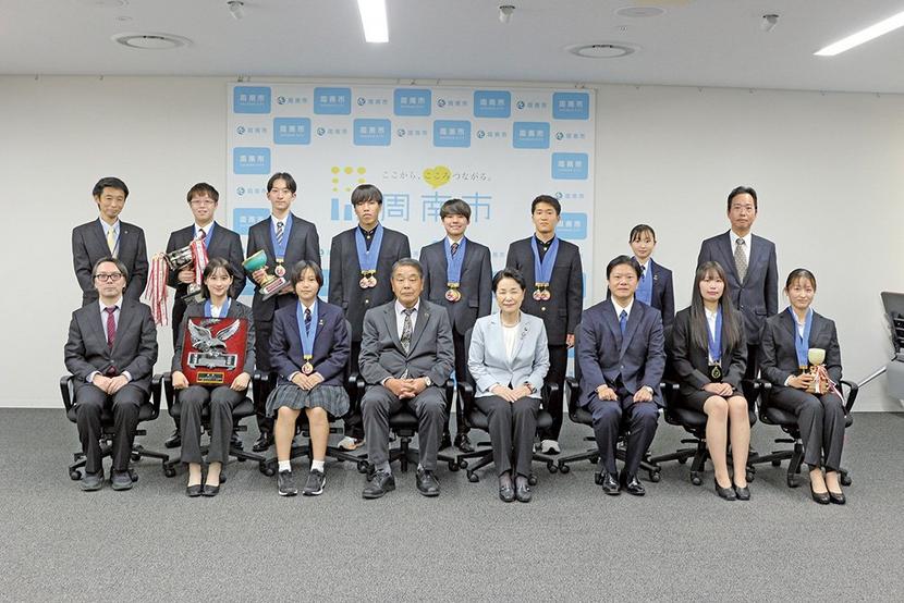 周南市の徳山高専の水泳部(桑嶋啓治顧問)とバドミントン部(栁澤秀明顧問)、ハンドボール部(池田光優顧問)の選手ら10人が1日に同市役所を訪問し、第58回全国高...