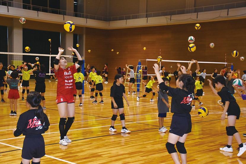 昨季のV3リーグで優勝した女子バレーボールチーム、倉敷アブレイズの選手を招いたバレーボール交流会が3日、周南市のゼオンアリーナ周南で開かれ、小学生のバレーボー...