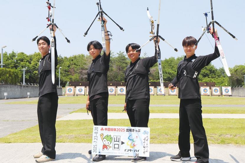 周南市の徳山高専(阿部恵校長)アーチェリー部の中村玲夢選手、木藤誠人選手、片山瑛大選手、手嶋海翔選手の2年生チーム4人が県高校総合体育大会アーチェリー競技で男...