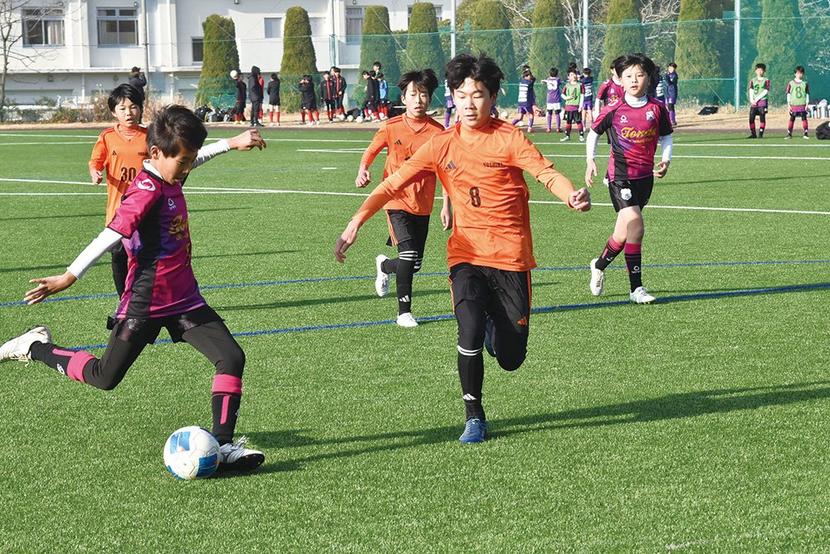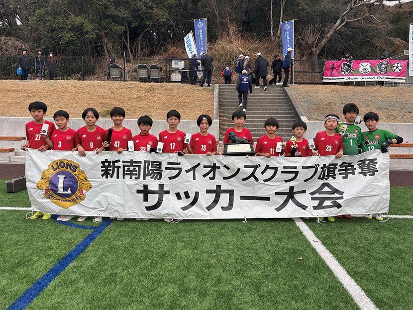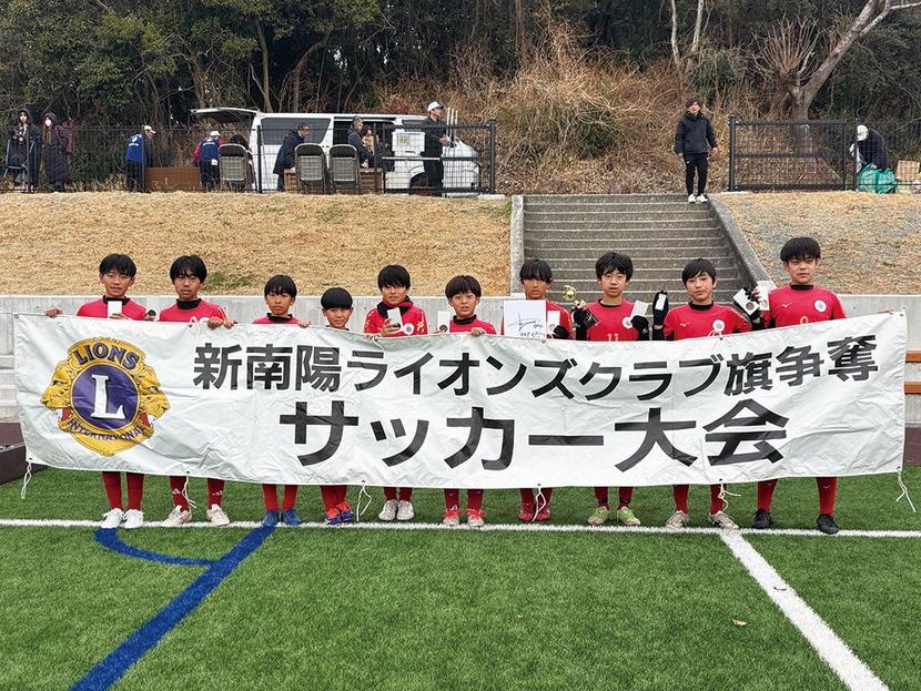 周南市の第31回新南陽ライオンズクラブ旗争奪サッカー大会が14日、周南緑地公園の市サッカー場で開かれ、県内と広島県から16チームが出場した。選手は人工芝の緑の...